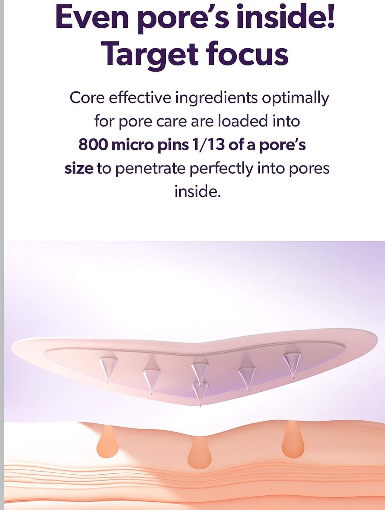 مزوّدة بـ 800 إبرة دقيقة (Micropins)، كل واحدة بحجم يعادل 1/13 من حجم المسام، ومحملة بمكونات فعّالة مخصصة للعناية بالمسام، لتتغلغل بدقة وفعالية داخلها.