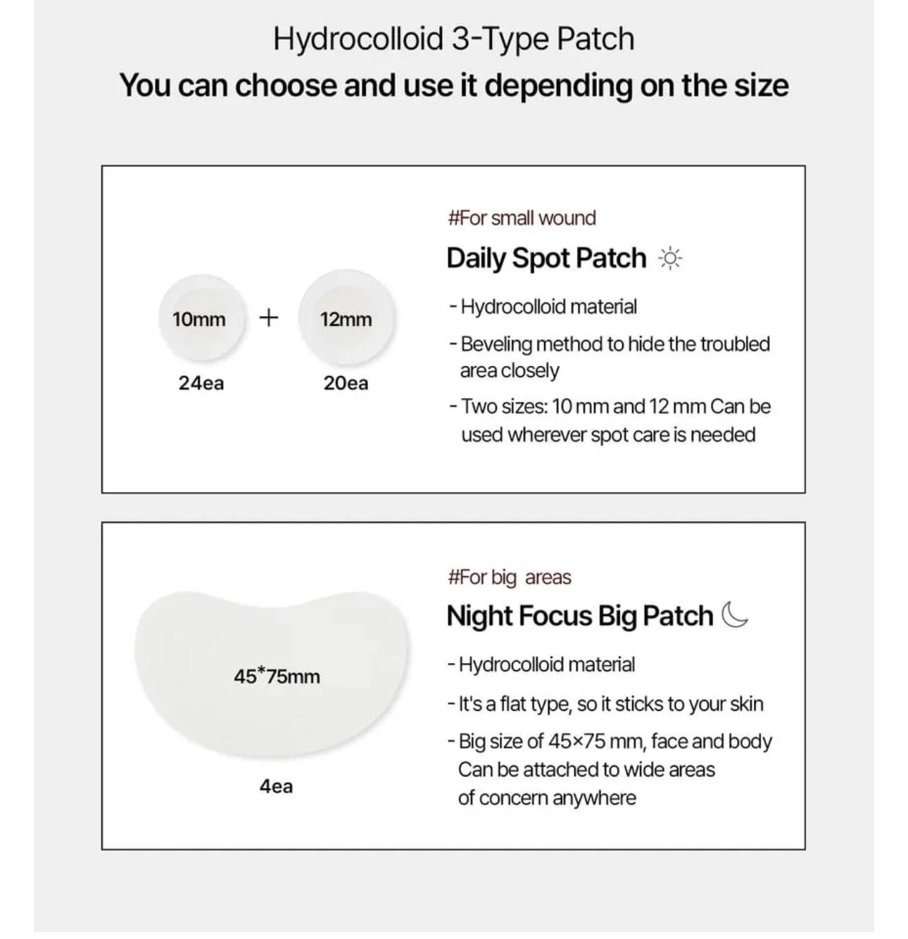 تحتوي العبوة على 48 لصقة بثلاثة أحجام مختلفة (لصقات موضعية صغيرة ولصقات ليلية أكبر)، لتوفير تغطية مرنة تناسب جميع الاحتياجات.